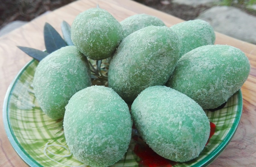 One of many stories about the saint recounts an episode involving olives: fleeing the soldiers of Quinctianus—a Roman proconsul who, failing to win the young virgin’s affections, had her tortured, sent to a brothel, and burnt at the stake—Agatha stopped to tie her shoe (as one does). While she knelt, a wild olive tree sprouted up before her, concealing Agatha from her pursuers and providing some needed nourishment. To mark this miraculous, temporary reprieve bestowed on Agatha, devotees also make sugary, marzipan-like olivette, colored with food dye and dusted with sugar.